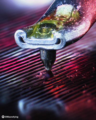 Line contact styli (also called Shibata, Fritz Geiger, Van den Hul, and other variations depending on the exact profile) take this further. Their contact radius along the groove wall can be as small as 2.5–5 µm — closer to the geometry of the original cutting stylus. This allows them to retrieve high-frequency detail that elliptical styli miss, particularly in the final third of the record side where groove velocity is lowest. The tradeoff is sensitivity to alignment: because the contact area is so narrow, azimuth, overhang, and VTA (vertical tracking angle) errors produce audible degradation that a more forgiving conical tip would not reveal as clearly.[6]